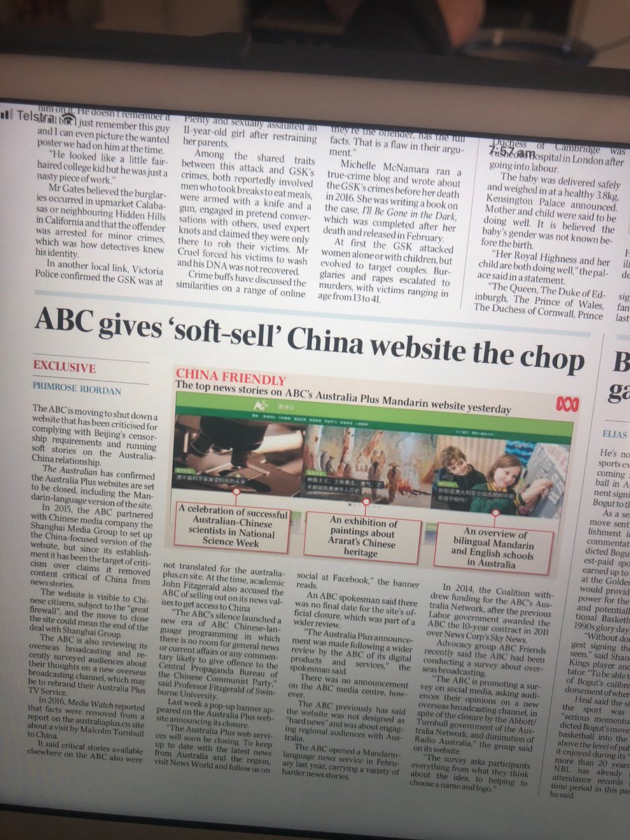 ABC to part company with politburo. Primrose Riordan @australian reporting ABC-Shanghai Media Group Australia Plus website is to close. “News” adverse to Beijing was omitted in accordance with editorial rules. Democracy for the great people of China still a long way off it seems https://twitter.com/QuentinDempster/status/988547165726257153/photo/1