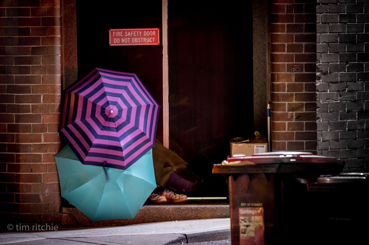 This shot was taken in the pitch black of night, the long exposure shows more. I thought it could have been an art installation or random design delight… only to notice the feet. This homeless person uses two umbrellas to create their personal space and a sense of security. https://twitter.com/timritchie/status/988549856653332480/photo/1