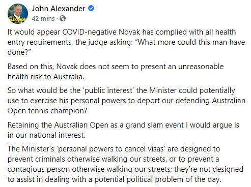 In a post on his Facebook page, the Liberal politician said Novak Djokovic appeared to have complied with all the health entry requirements, and he did not seem to present an unreasonable risk to Australia.