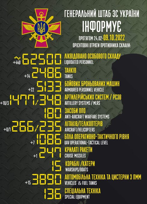 Загальні бойові втрати противника з 24.02 по 09.10 орієнтовно склали / The total combat losses of the enemy from 24.02 to 09.10 were approximately: