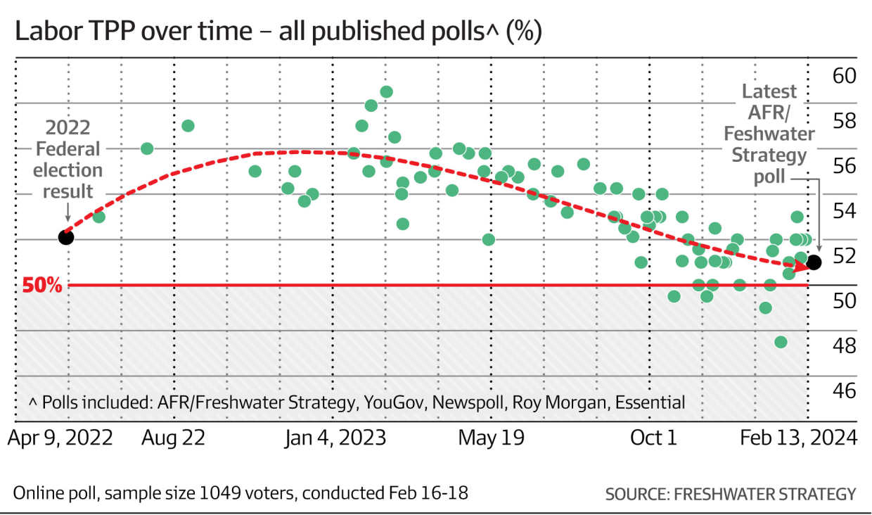 A preferred prime minister measure has Anthony Albanese leading Peter Dutton 42-38, little changed from 43-39 in December. A question on the tax cut amendments finds 44% supportive, 26% indifferent and 15% opposed, with 32% expecting to be better off, 12% worse off and 43% anticipating no difference. The poll was conducted Friday to Sunday from a sample of 1049.