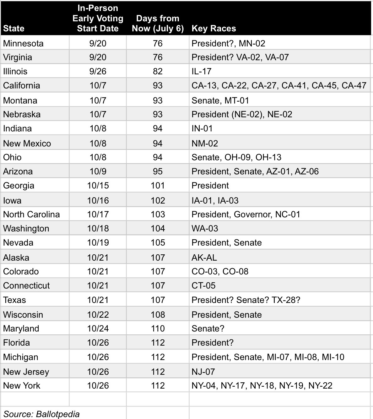 On a positive note with regards to timing, the first of the early in person voting doesn’t start until September. If the Democrats were to change horses at the convention that at least gives the new person a few weeks to get themselves into those states. Still not ideal.
