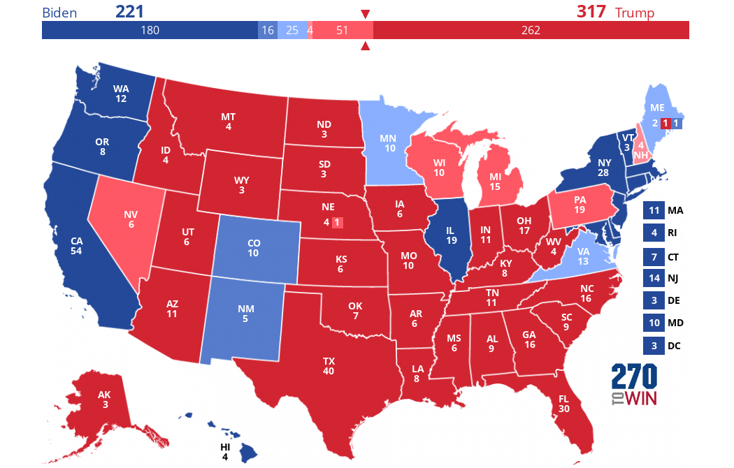 So, my projection is that it could as low as 180 for Biden but as high as 276 but don’t let the latter fool you into thinking it could go either way – 270+ is a longshot.