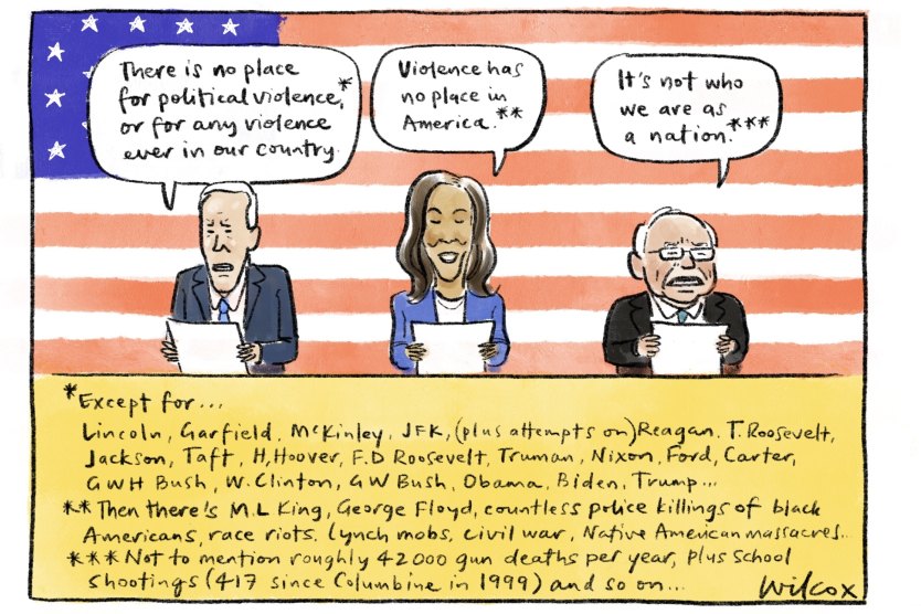 I think the Wilcox cartoon misses the mark a bit. The long history of attempted assassinations in America is not an asterisk against saying there’s no place for political violence. It’s all the more reason to emphasise it is not a legitimate part of the system.