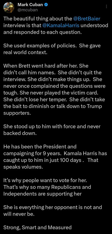 Not all billionaires are slavishly following Trump – Mark Cuban, who started Oracle and now owns the Dallas Mavericks NBA team like Kamala..