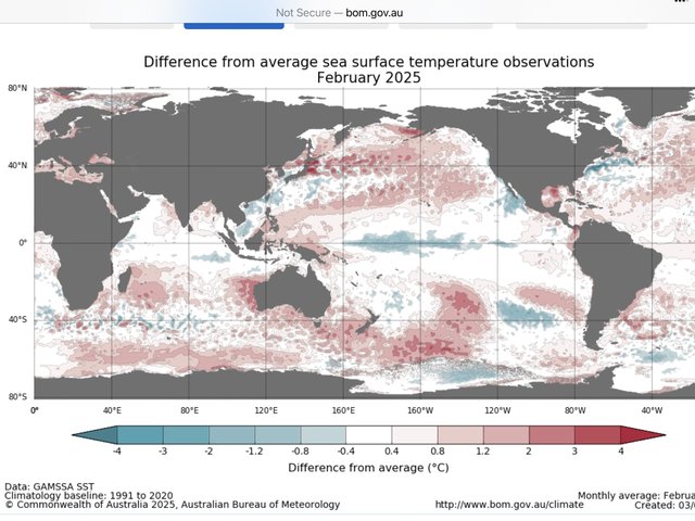 This map of global sea temperature anomalies from historical averages is a bit of a worry. It’s a sea of red.