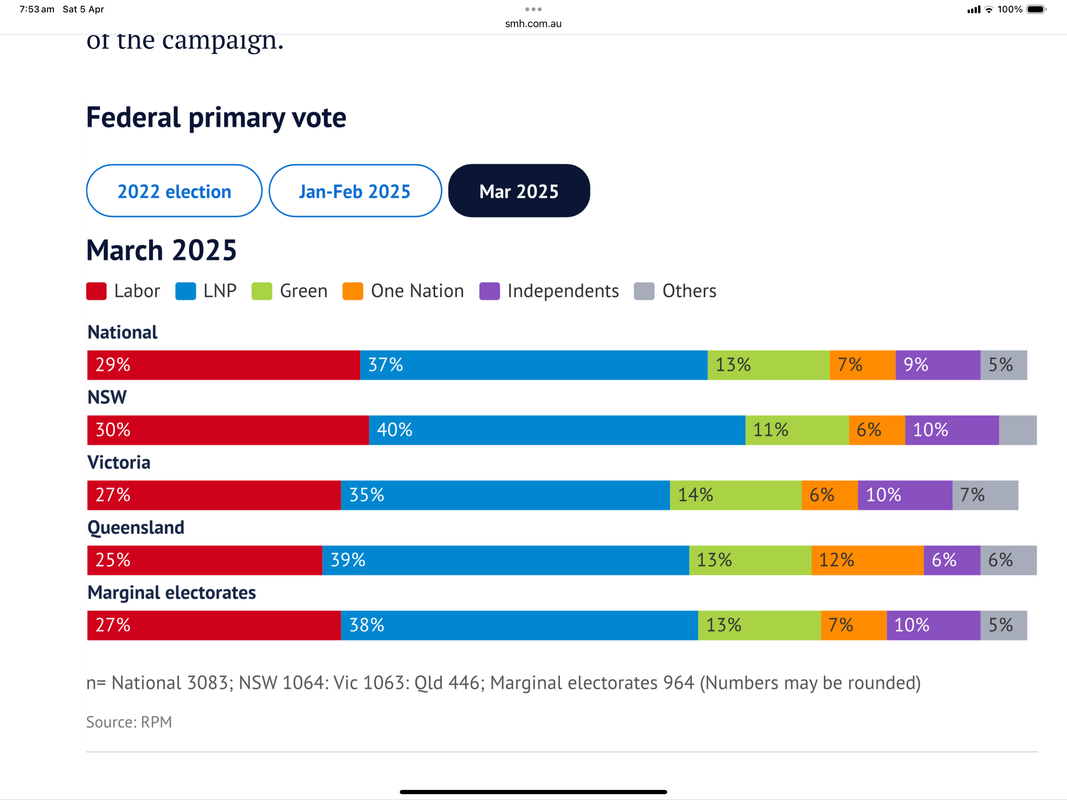 Thirty-three per cent felt Labor’s “economic vision” was better for themselves compared with 28% for the Coalition; 31% felt Labor’s was better for Australia compared with 29% for the Coalition. Questions on individual policies are favourable to the Coalition to the extent of recording a net plus 47% for a 25% cut in the permanent migration program and plus 39% for fast-tracking new gas projects. Views are less favourable on reducing the public service by 41,000 at plus 5%, and less favourable still for ending public servants’ work from home arrangements, at minus 5%. The poll had an unusually long gestation period of March 8 to April 1 and a sample of 1006 (UPDATE: The report turns out to be in error – March 8 should read March 28).